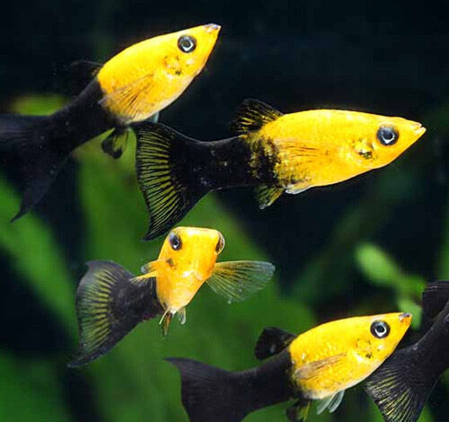 メスの体内で卵が受精し稚魚の姿で産まれてくる卵胎生の魚です。体の前後が黄色に近いオレンジと黒色にはっきり分かれた独特な体色をしています。最大で6cm程になり水槽内のコケなどもよく食べます -