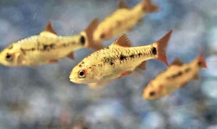 ウロコが金色に輝き、まるで金の延べ棒のようです。元気に水槽内を泳ぎ回ります。オスはメスより小さく、繁殖時には腹部が赤くなる婚姻色が出ます。 -