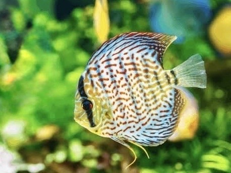 円盤のような体形で南米アマゾン川に群れで生息し、熱帯魚の王様とも言われます。その体長は20cm前後になり、グリーンやイエロー、ブルーやオレンジなど豊富な体色や模様の美しさは優雅な泳ぎを際立たせます。 -