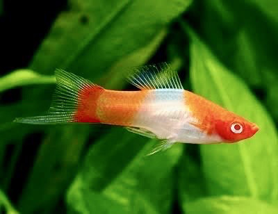 ソードテールという熱帯魚の改良品種で、赤と白のコントラストが美しく、錦鯉のような模様を持つことから正式名称は「ルビーアイ・紅白ソードテール」とも呼ばれ、アルビノ種であるため赤い目を持つのが特徴です。 -