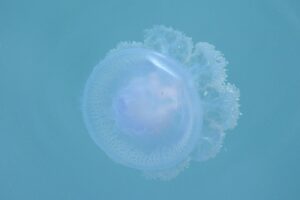 タコクラゲは、褐色の丸い傘に白い水玉模様があり、足のような付属器をユラユラ動かすクラゲです。傘や付属器の本数がタコと同じ8本であることから、この名前がつきました。