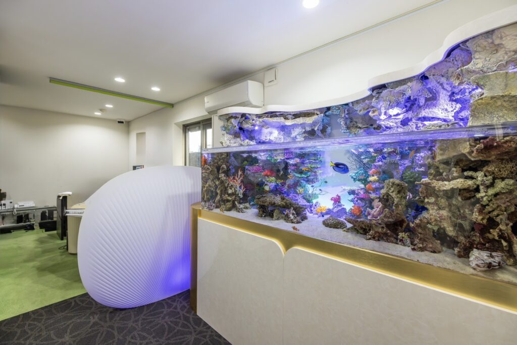 当初は、既存の大型水槽を活かしたリニューアル案も検討していました。しかし、お話を伺う中で奥様からこぼれた一言が、場の空気を一変させました。「会社の内装も新しくする予定だから、この際水槽も新しくしたほうがいいんじゃない」その提案に、社長は優しい笑顔で「そうだよね、じゃあその方向で」と即決。奥様への深い愛情と、価値観を尊重する器の大きさに触れ、私たちの制作意欲も一気に加速しました。