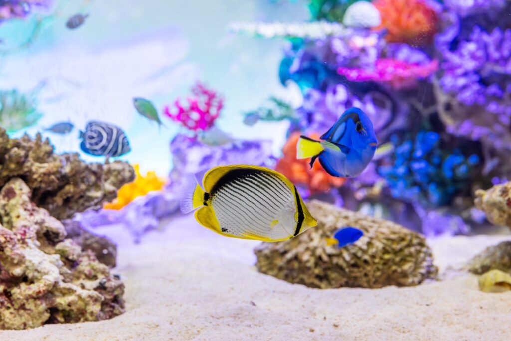 白化したサンゴに新たな命を吹き込む特注コーラルウォール、3ヶ月間じっくり熟成させた天然サンゴ砂で立ち上げ直後から安定した水質を実現。