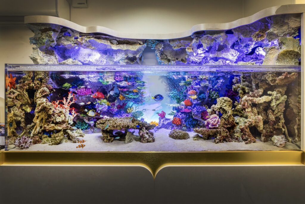 完成した水槽は、奥様のご意向で明るめのトーンに仕上げた「琉球石灰岩」のような岩壁が特徴です。20種50匹の海洋生物たちが優雅に泳ぎ、水面の揺らぎが底砂に幻想的な影を落とします。