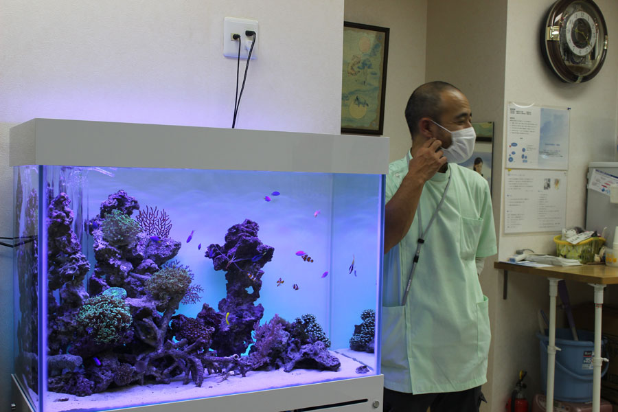 設置後に等々力院長が水景を気に入れば水槽との2ショット写真を頂くことになっていて・・・撮らせていただきホッとしました。まだ行かなきゃならないところがあるからさ『じゃっ!』と言い残し足早に去っていきました。患者さんやスタッフの方のために設置した水槽だと思いますが、忙しいを通り越したところで働き続ける等々力院長が少しの時間でも、ホッとできた時にその視線の先には『綺麗な水景がある』そのような気持で、アメイジング・ジョブ~アクアは『癒しの空間提供』を続けます。